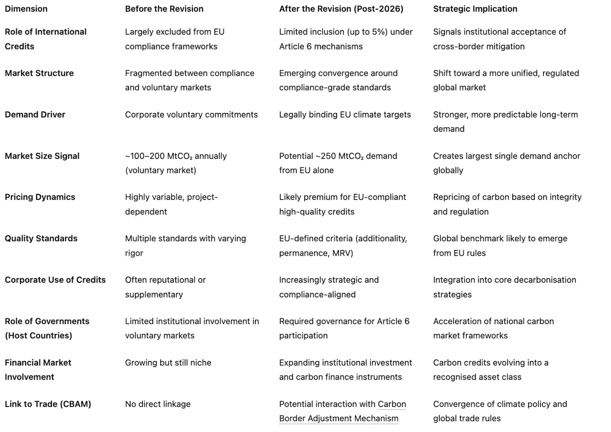 What we are seeing now is a recalibration. The EU is acknowledging that achieving deep decarbonisation, particularly in sectors where emissions are difficult to eliminate, may require some degree of international cooperation. But importantly, this is not a relaxation of standards. It is a controlled opening, where the EU intends to define what high-quality credits look like.